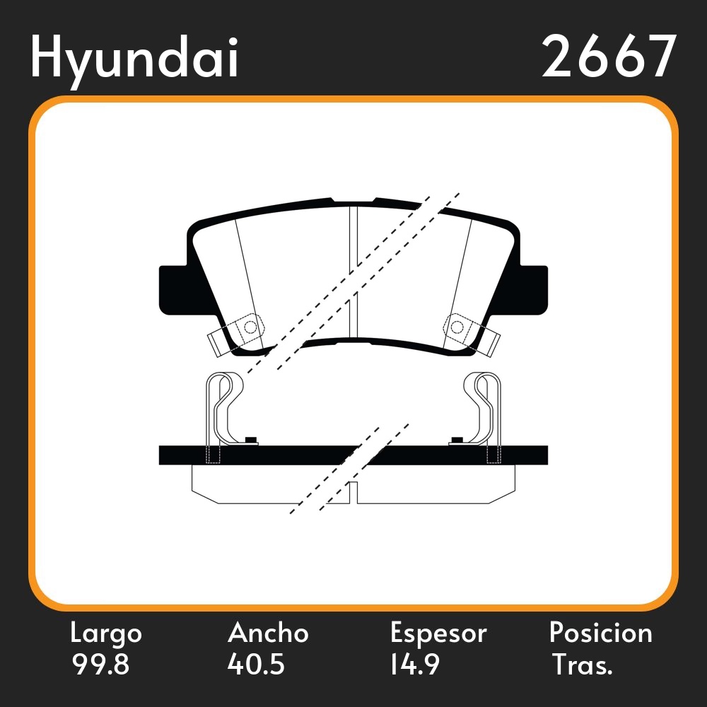 PASTILLAS DE FRENO KIA SELTOS-SPORTAGE-RIO-CERATO HYUNDAI ACCENT ELANTRA IONIQ TUCSON 1.6 2.0 / TRASERA / L=99.80 A=41.00 E=14.90 MEDIDAS UBICACIÓN 1238 EQUIVALENCIAS FRAS LE PD/1661