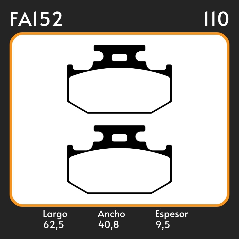 PASTILLAS DE FRENO YAMAHA YBR 250 ´10-´11/ FAZER 250/SUZUKI DR 250 S LAR. 62.5 ANC. 40.8 ESP. 9.5 POSC. TRAS. GUARDADO 50 EQUIVALENCIAS FA152