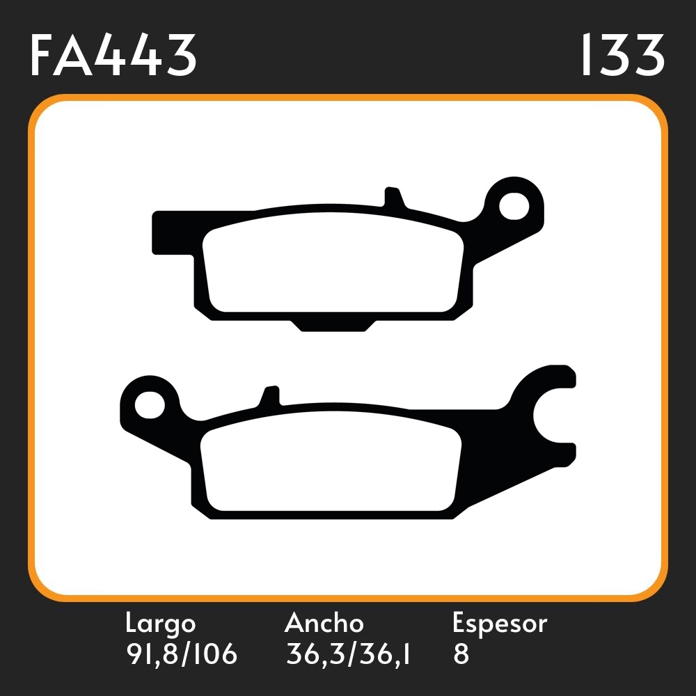 PASTILLAS DE FRENO YAMAHA YFM 250 / 550 / 700 LAR. 91,8 106,75 ANC. 36,3 36,15 ESP. 8 POSC. DEL. GUARDADO FA 443